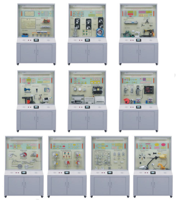 5、柜頂部裝有照明日光燈,柜背設有對開門,有利維護設備和方便維修。柜下部設有柜箱,方便存放單個模型、實驗箱及相關實驗文檔。柜底裝有萬向輪,方便移動,符合人機工程要求。